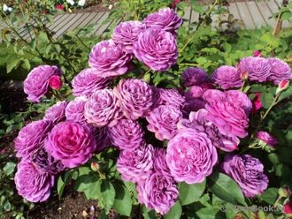 Патио/мини роза, с густомахровыми, фиолетово-розовыми цветками с насыщенным пьянящим ароматом.