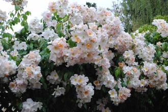 - В окраске доминируют кремовый и медовый цвета. Они хорошо сочетаются друг с другом и могут по мере старения выцветать до белого цвета. Выцветание не умаляет прелести цветков, окраска не становятся некрасивой по сравнению с первоначальной. Сорт здоровый, выносливый, но в самых холодных регионах ему требуется защита. Легкий приятный прохладный аромат - отдельный цветок почти не пахнет, но все вместе они распространяют ощутимое благоухание. В крупных кистевидных соцветиях насчитывается до 40 бутонов. Растение густо покрыто соцветиями, и, когда оно в полном цвету, не видно ничего, кроме цветков. Цветки в соцветиях распускаются постепенно, поэтому цветение продолжается долго. В конце сезона цветение повторяется. Кусты крупные, сильные, ветви способны удерживать тяжесть многочисленных цветков. Сорт устойчив к болезням.