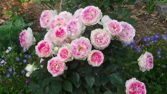 Цветки чашевидные, густо-махровые, двухцветные - почти белые крайние лепестки и ярко-розовый центр.