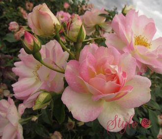 Цветы среднего размера умеренно махровые, в полном роспуске показывают серединку со светлым пятном в центре и пучком желтых тычинок, цветение все лето, середине зеленая листва с привлекательными красными прожилками, Цветки кремово-белые с розовой окантовкой, с возрастом уходят в розовый