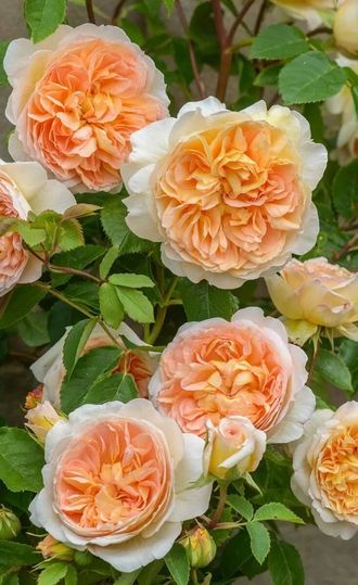 Длинные, элегантные, абрикосово-желтые бутоны раскрываются в классические плоские розетки размером 10-12 см каждая, наполненные множеством плотно уложенных лепестков. Цветы демонстрируют красивое сочетание оттенков: верхняя сторона лепестков имеет нежный абрикосово-розовый тон, в то время как нижняя сторона - приятный мягкий желтый оттенок. Наружные лепестки каждого цветка - кремового тона, что дает замечательный эффект ореола. Общее впечатление от цветов - насыщенный абрикосовый цвет. Роза обладает великолепным ароматом с нотами мирры - цветочный и теплый по характеру, с оттенками меда. По мере старения цветов аромат приобретает нотки чая.