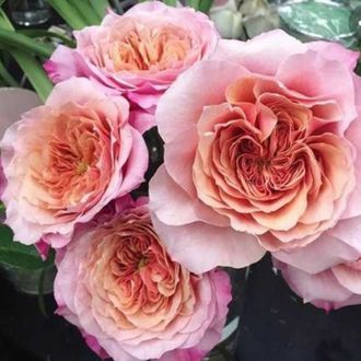Розовые бутоны раскрываются в абрикосово-персиковые цветки с розовыми наружными лепестками. Лепестки плотные, формируют форму звезды.