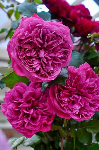 | Цветки густомахровые, ностальгической формы пурпурно-малинового цвета, с легким ароматом. Куст прямостоячий, с темно-зеленой листвой, и красноватыми молодыми побегами. Устойчив к заболеваниям. Зимостойкость - 6 зона. | |