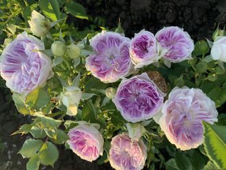 Сильномахровые розетковидные цветки с пуговкой в центре собраны в соцветия. Легкий аромат. Цвет розы - белый с сиреневым, с переливами, в бутоне кремово-зеленая.