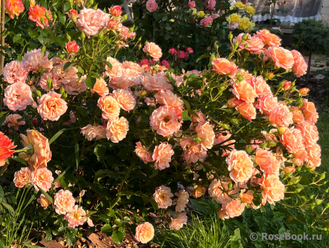 Цвет абрикосовый или с оттенком. При выцветании появляется розовый налет. Аромата нет. Цветки средние, махровые (17-25 лепестков), в малых кистях. Цветет в течение всего сезона.