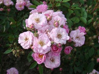 Цветки очень маленькие, диаметром 1-2 см, махровые (17-25 лепестков), розеточной формы, светло-розовые с лиловым оттенком, в нависающих соцветиях, которые распускаются сверху вниз до основания соцветия. Лепестки крошечные, как у миниатюрной розы, со временем белеют. Цветение почти непрерывное, до заморозков. Листья маленькие, тёмно-зелёные, очень устойчивые к болезням. Побеги почти без шипов. Куст высотой 40-50 см, густой, хорошо разветвлённый.