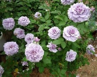 Цветы нежно-сиреневые, с более насыщенным тоном в центре, со временем приобретает седовато-дымчатый оттенок. Цветки средних размеров с идеально уложенными лепестками, диаметр цветка 6-8 см, с легким нежным ароматом. Цветение одиночными цветками или собранными в соцветия по 3-5 цветков, повторное.