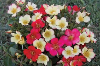 Простые цветки раскрываются из желтых бутонов с красными кончиками. С возрастом лепестки краснеют. На кусте присутствуют одновременно цветки разных оттенков нежно-желтого и красного. Листва темно-зеленая, глянцевая