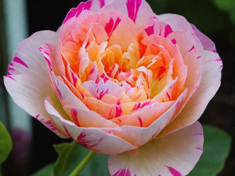 Плетистый сорт со множеством достоинств. Темная глянцевая листва выгодно оттеняет великолепные чашевидные цветы в старинном стиле, с закрученным светящимся центром. Цветение букетное, по 3-5 роз в кисти, обильное. Сам цветок кремовый с розовыми полосами и насыщенным сливочно-желтым центром, более 80 лепестков, с исключительным фруктовым ароматом (цветочно-летние ноты, лесные ягоды, вишня, персик и спелый абрикос). Роза напоминает нарядное пирожное или клубнично-ванильное мороженое.